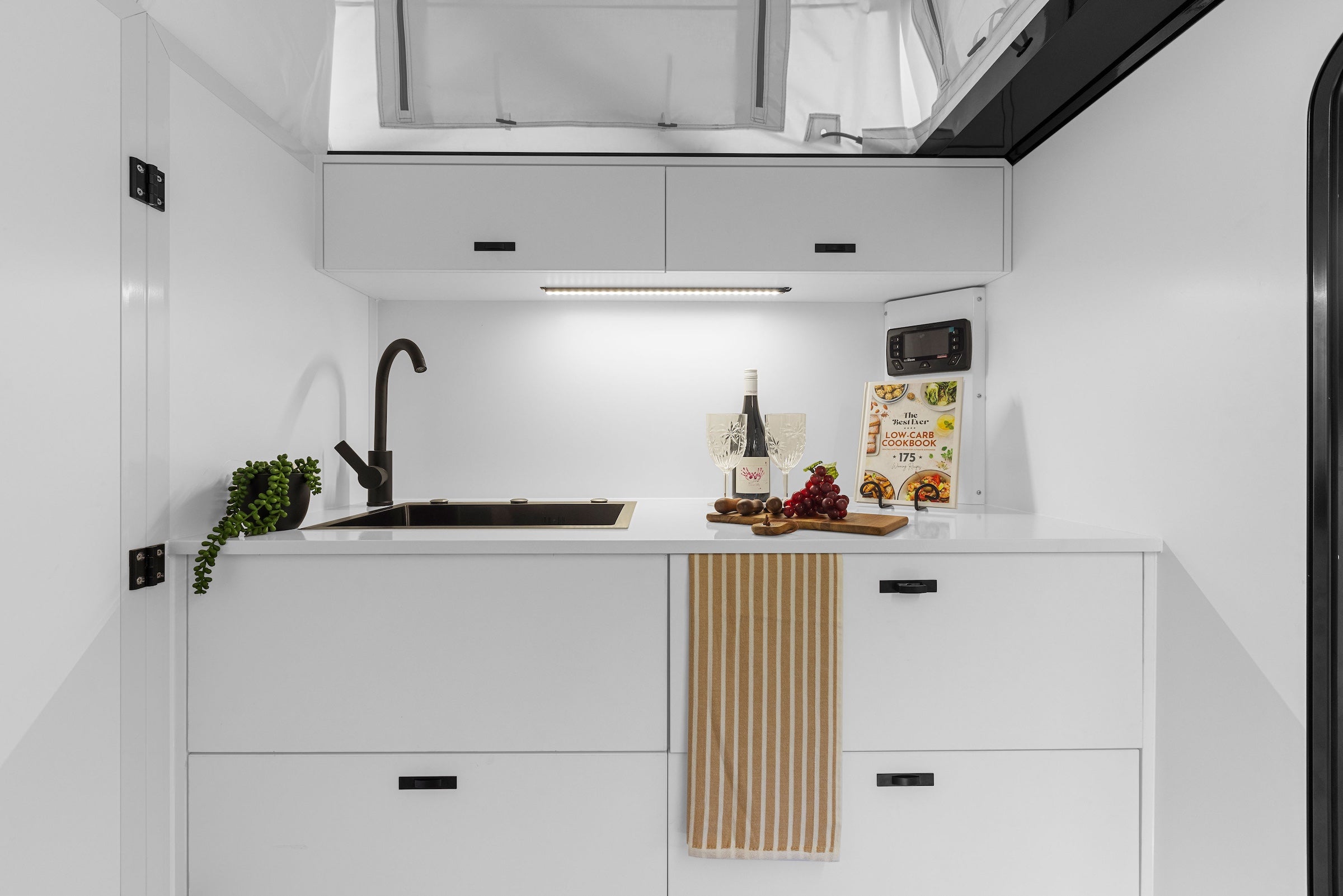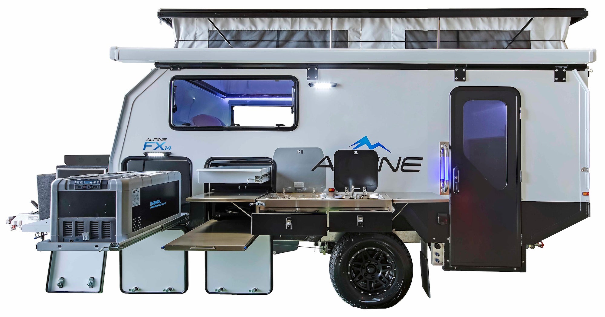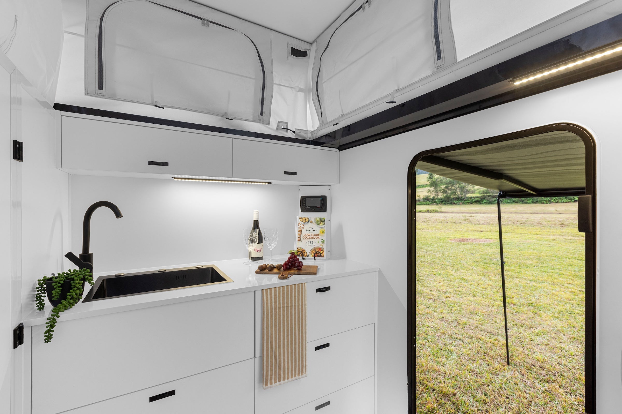 UPDATE: All ALPINE models with an external kitchen now come standard with dual induction cooktops (replacing the gas burner) and a standard REDARC 3000W inverter. - Massive External Pantry & Storage Drawers – Carry all your supplies with organised, easy-access compartments.