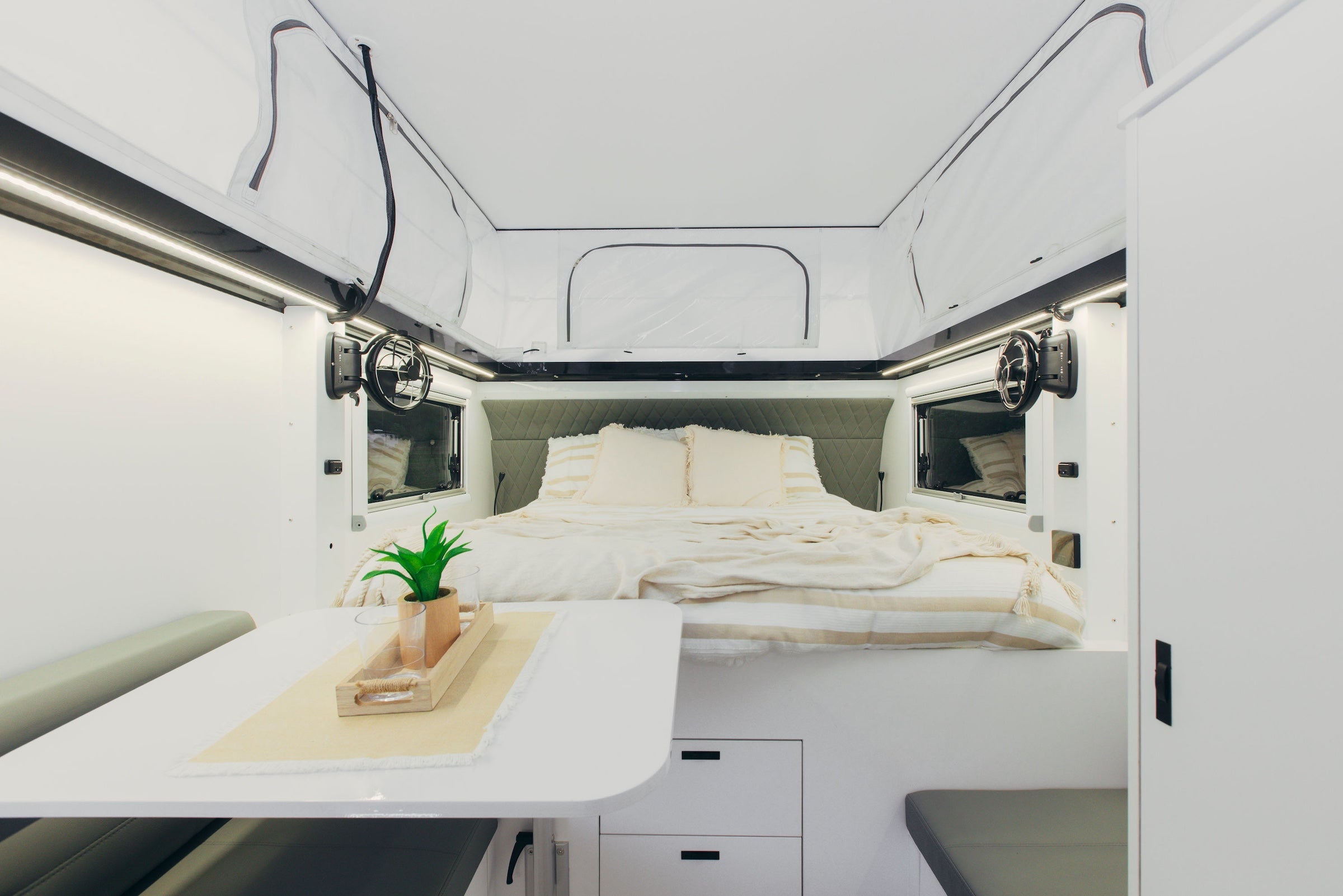 Packing impressive features into a streamlined footprint — the 14 & 15 hybrids offer comfort, storage, and practical living spaces designed for real-world off-grid travel. Both include our new internal slide-out dining table at seating.