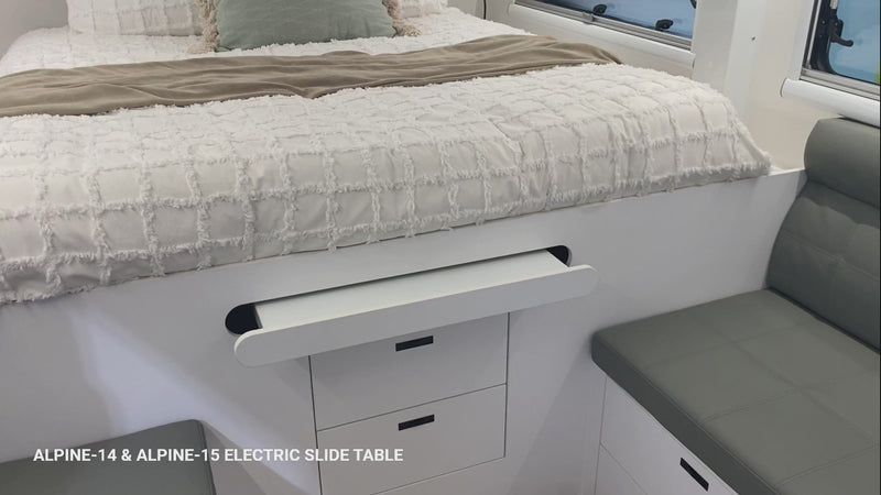 The new electric sliding table in the ALPINE-14 & ALPINE-15 gives you extra room exactly when you need it.