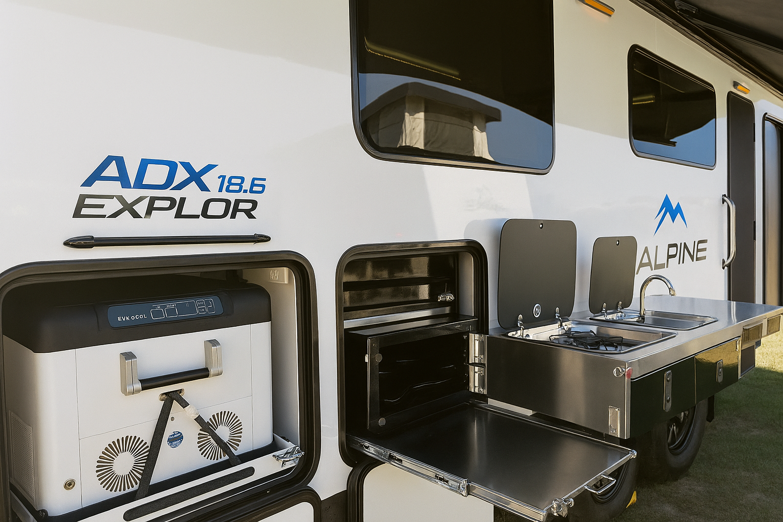 - Full External Swing-Out Stainless Steel Kitchen – Cook, prep, and clean up with ease anywhere your adventure takes you.