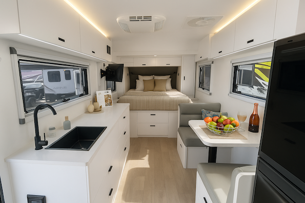 95L fridge slide, external hot/cold shower, and huge storage areas total liveability.