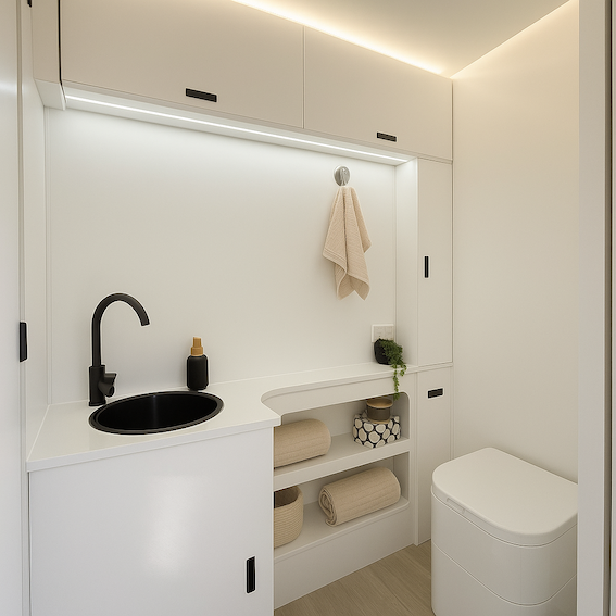 - Full Ensuite with Separate Hot Shower, Compost Toilet & Vanity – Freshen up in comfort with your own private bathroom on board.