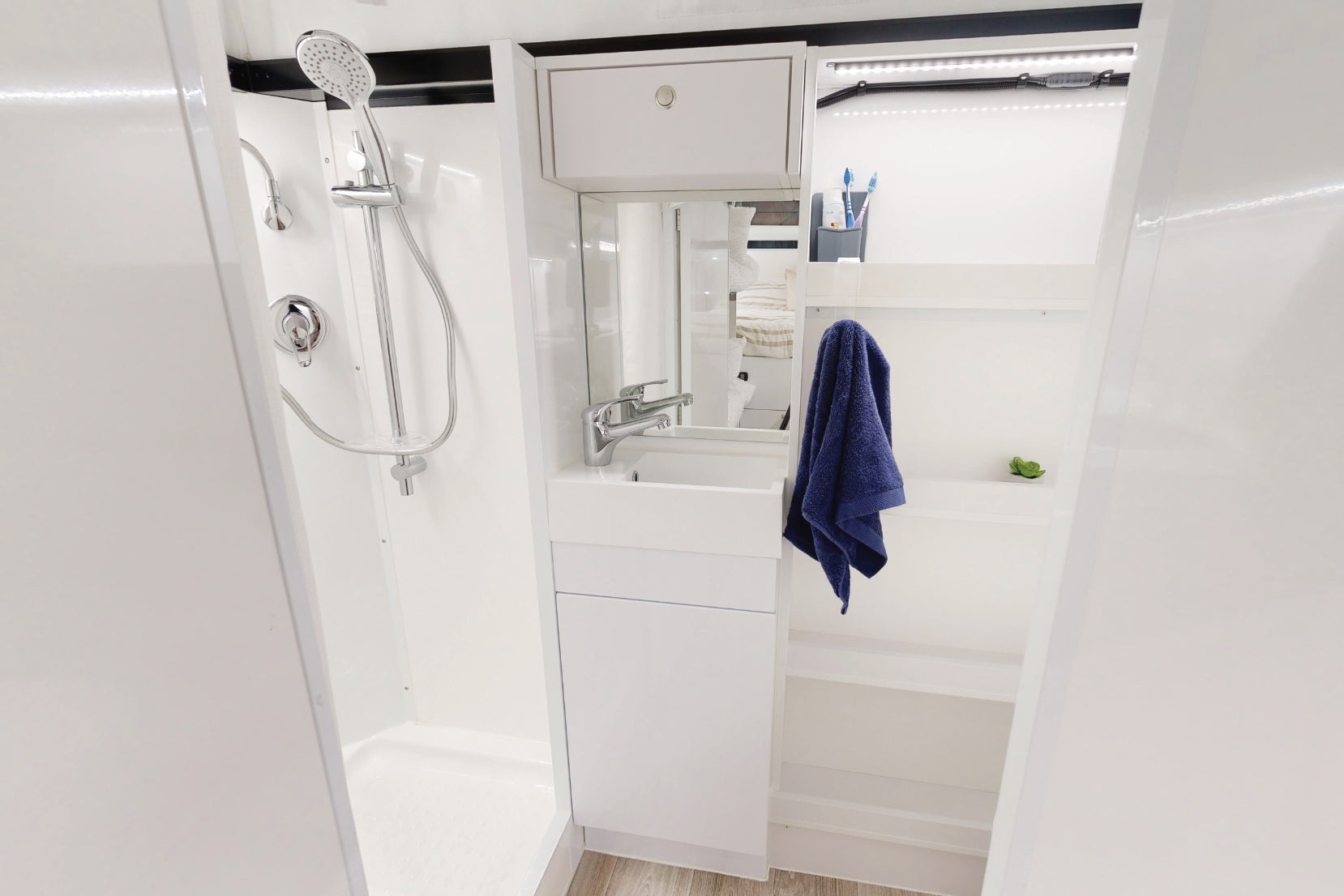 95L fridge slide, external hot/cold shower, and huge storage areas total liveability.