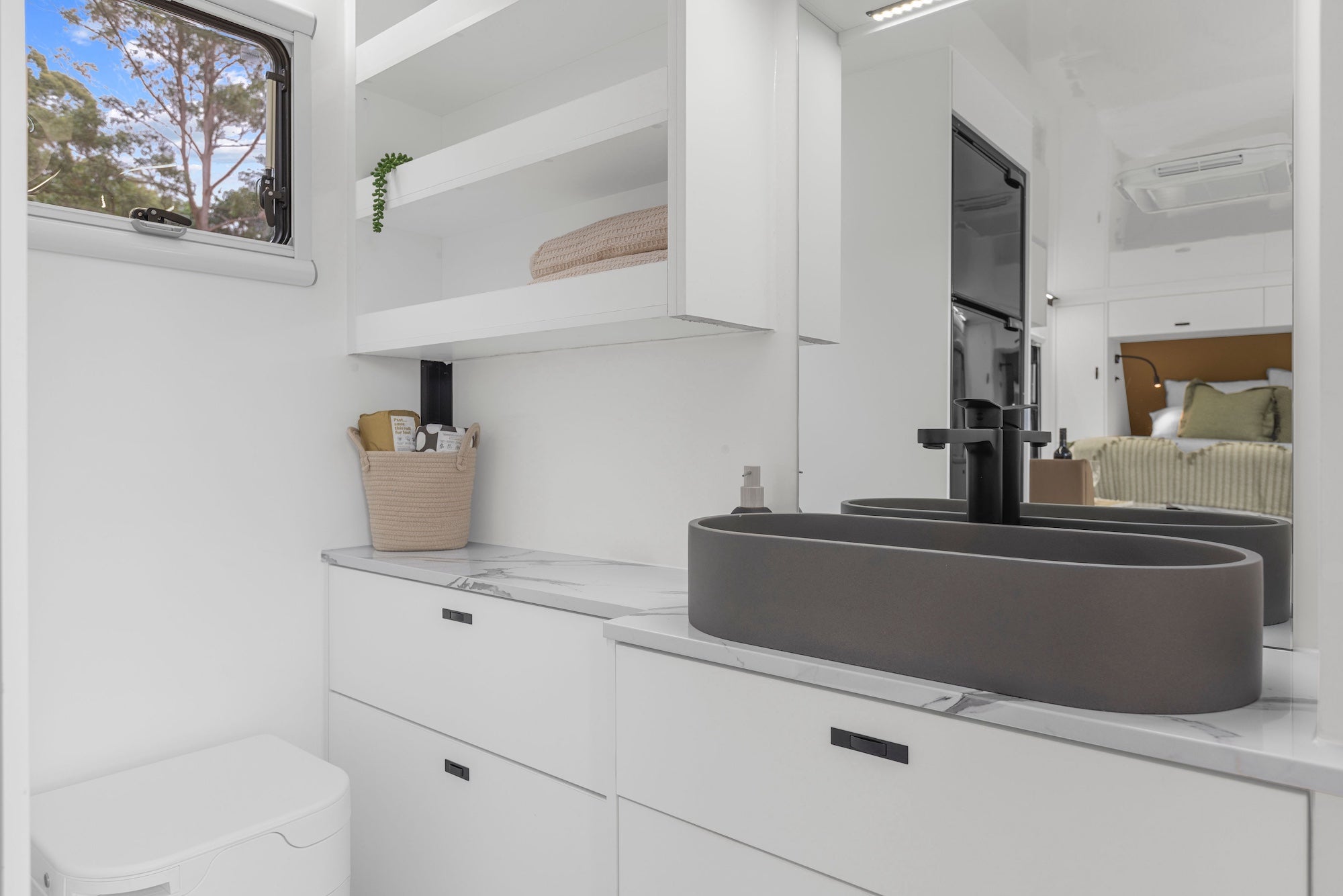 - Full Rear Ensuite: Separate Hot Shower, OGO Compost Toilet & Vanity Combo