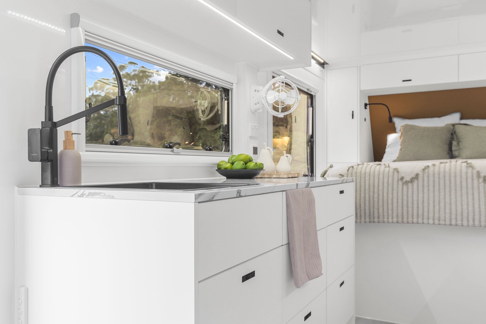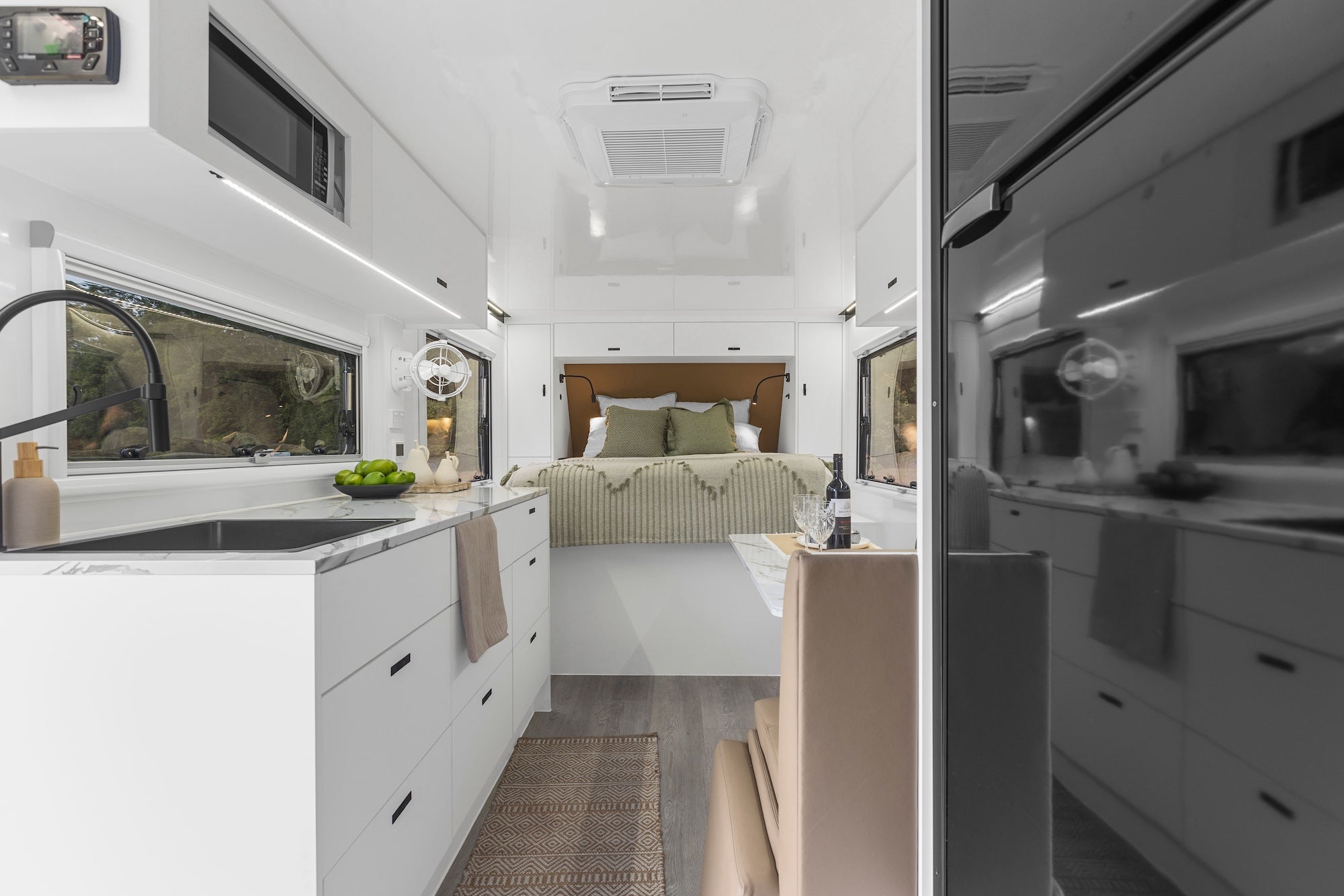 Inside, enjoy a spacious walk-around queen island bed, expansive storage, and a beautifully appointed full ensuite with separate toilet and shower. The open-plan interior flows effortlessly into external living zones with Alpine's famous full external swing-around kitchen.