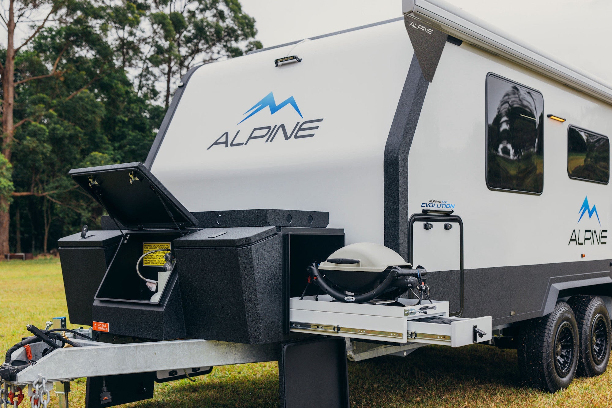 Brian takes you through the optional external kitchen and fridge upgrade for the EVOLUTION 19.6 - the same signature setup found across the ALPINE hybrid range. See how the slide-out kitchen, fridge compartment, and BBQ slide transform your outdoor cooking experience.