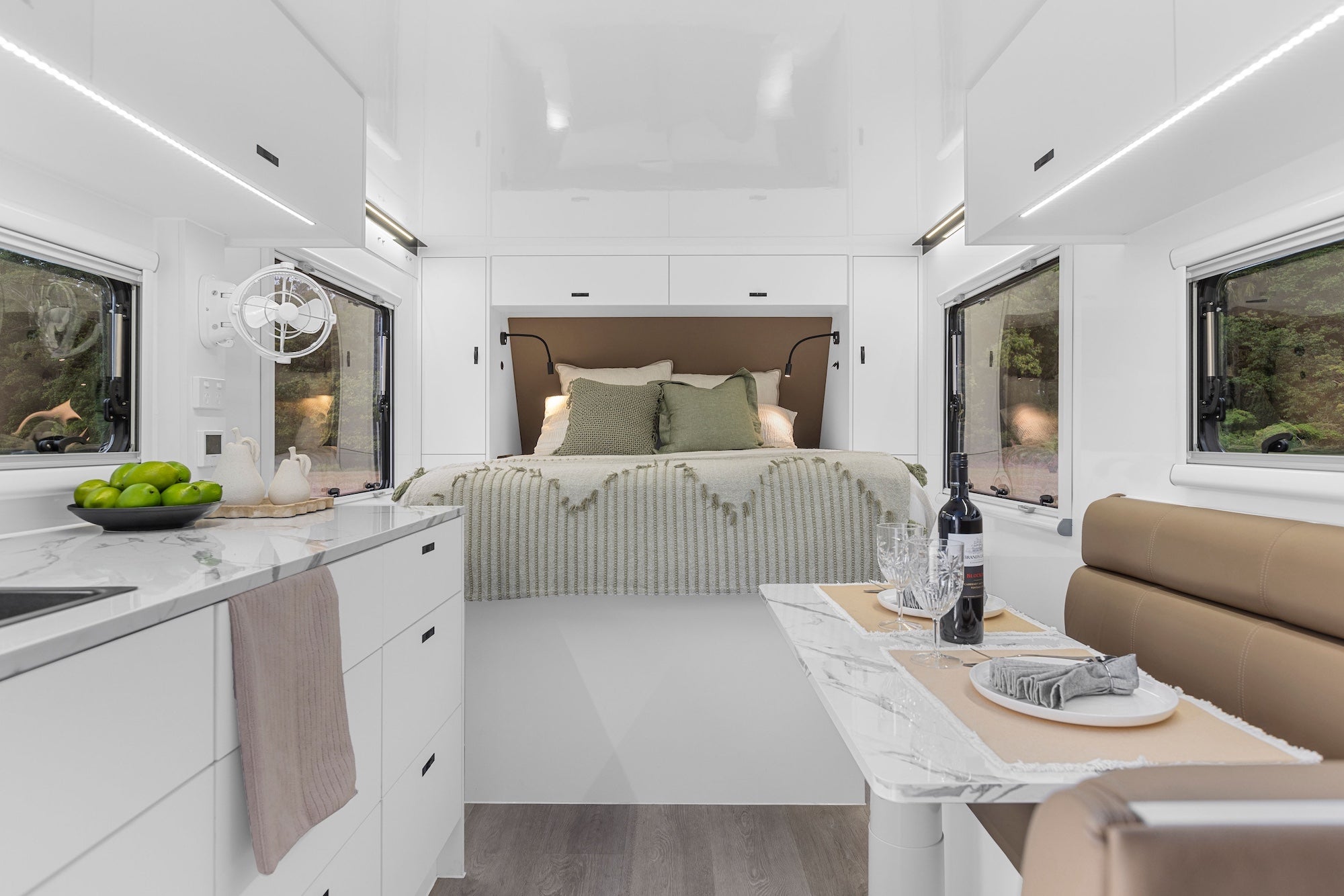 95L fridge slide, external hot/cold shower, and huge storage areas total liveability.